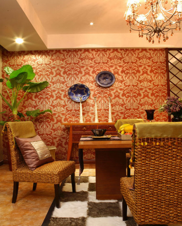 热带的人们喜爱艳丽的色彩,这从印度妇女以及越南妇女的服饰装束中都可看出,浓烈的桔红色、香艳的黄色、神秘的紫色、以及明丽的绿色都是体现东南亚风情的主要色彩。以往人们很少把墙面做成很“刺眼”的颜色,而如果你的家居定位为有热带气息的东南亚风格,那么千万别吝惜墙面色彩的运用,只要与家具搭配得当,这些壁纸的色彩是非常动人。