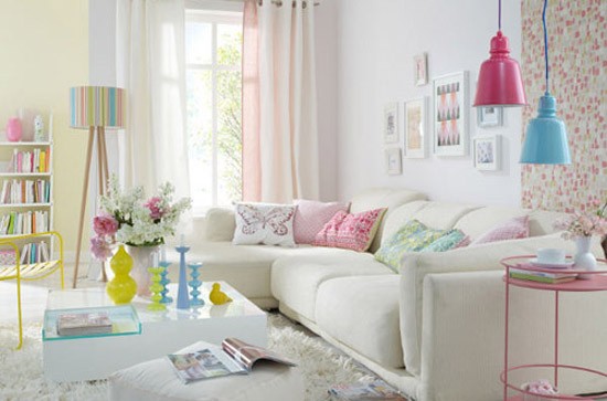 这类室内色彩大多以暖色为主体,以少有的冷色为点缀色,这种室内环境的色彩采用的颜色以淡白色(或乳白色)、淡紫色、橘黄色、淡黄色、粉红色、紫红色,少量的天蓝色、墨绿色或粉绿色为构成体系,此类型给人们的感觉清新明快,轻松舒适,多为年轻人所喜爱。