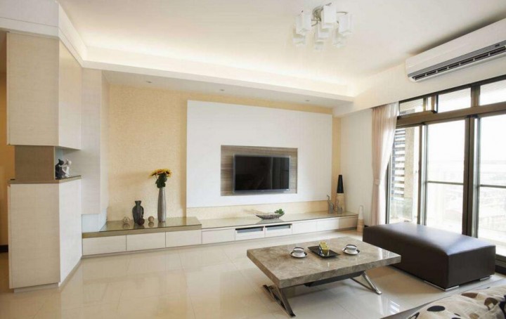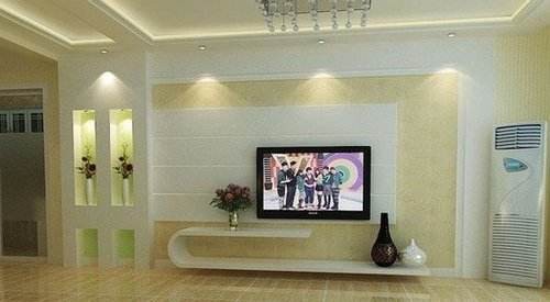 此类电视背景墙突出“素雅”一次,通常使用米白色或者近似暖色调的整体布局,墙面上花纹的搭配也以小花纹,直线条为主,很少有突兀的、绚丽的元素。这种类型的电视背景墙在一般家庭中很是常见。