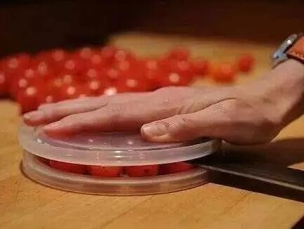正解:用两个特百惠的盖子夹住圣女果无法方便地切开它们。