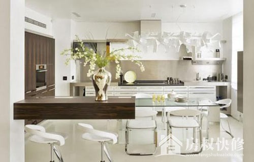 现在的户型设计,多将厨房面积加大,或是与餐厅连为一体,许多人也仿效国外的厨房设计,把厨房设计成餐厨一体化,甚至是餐厨客一体化。这种设计固然有其积极的一面,主妇在操劳时,在她的视线中始终有家人的陪伴,很人性化。但考虑到国人的饮食习惯,建议这种搭配还是慎用,尤其是喜欢在家享用美食的人士。 如果真是就喜欢这种风格搭配,不妨改良一下,可以把烹饪灶台“关闭”起来,四周用玻璃材质,既不挡视线,也可以阻隔油烟。