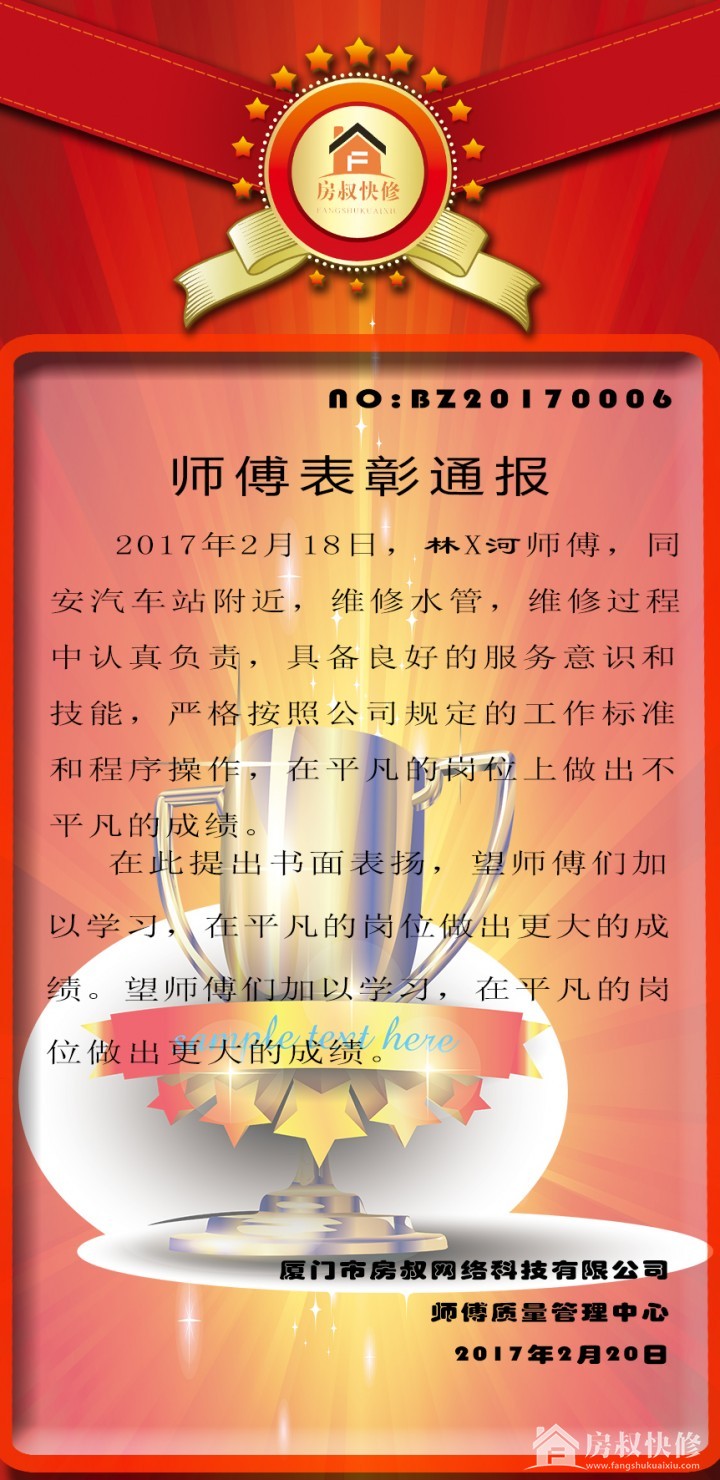 NO:BZ20170006 2017年2月18日,林X河师傅,同安汽车站附近,维修水管,维修过程中认真负责,具备良好的服务意识和技能,严格按照公司规定的工作标准和程序操作,在平凡的岗位上做出不平凡的成绩;在此提出书面表扬,望师傅们加以学习,在平凡的岗位做出更大的成绩。 厦门市房叔网络科技有限公司 师傅质量管理中心 2017年2月20日