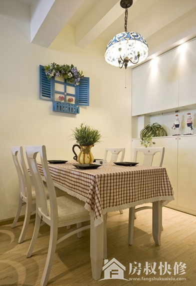 浅色的木地板和白色的餐桌椅搭配出清新气质,铺一块红格子桌布,立刻有了像郊游野餐一样的休闲氛围。墙上的蓝色小挂饰,让清新的地中海风更加浓郁。