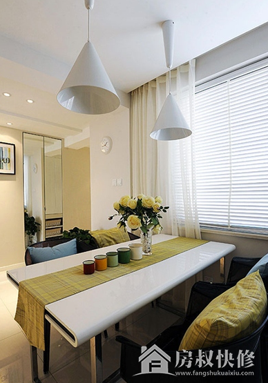 具有亲和力的一个餐厅布置,单靠餐桌上的一块桌布就能成为整个餐厅的亮点。原本简洁纯白的桌椅顿时有了如童趣般的生机与活力,半高的隔断墙划分出区域却又不阻隔视线。