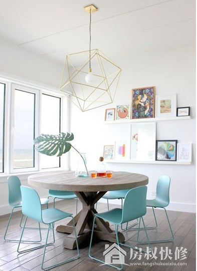 圆形的餐桌很能体现家庭的团圆感,一家人和和睦睦的享用美食也是一种至上的享受,原木色的餐桌和蓝绿色的餐椅仿佛向你诉说着有关色彩的故事。