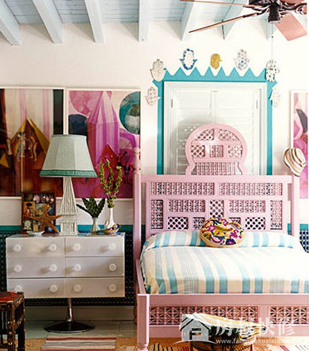 卧室采用粉色调的多彩搭配,并用另类的家具与图案,演绎出卧室的别致。家具中,最为吸引人的无疑是粉色床架,别趣的床头板造型配合多种镂空手法,让床很是精致。而装饰中,最抢眼的莫过于床头背景墙,由一组组色彩浓郁的艺术装饰画组成,给卧室营造出十分梦幻的浪漫氛围。