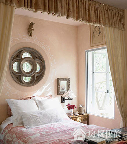 米黄色的墙面,与粉色的布艺装饰,带来十分温馨的感觉,躺在其中身心得到彻底的放松。靠墙的单人床,给小卧室充分的留白空间,让卧室不显得拥挤。画框中的艺术作品,给卧室强烈的人文信息,一个舒适的古典沙发,让自己有一个舒适的阅读空间。