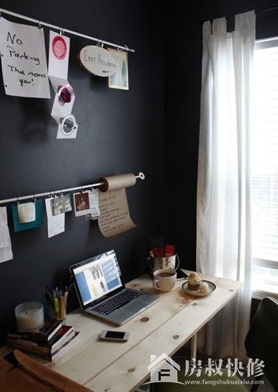 这是一个超酷的工作台设计,书桌靠墙的墙面设计了黑白,这样以来很多事情或是备忘都可以直接写在墙上了,是不是很节约资源呢。