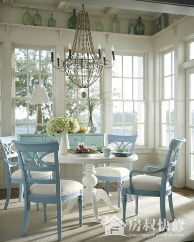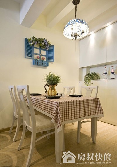 浅色的木地板和白色的餐桌椅搭配出清新气质,铺一块红格子桌布,立刻有了像郊游野餐一样的休闲氛围。墙上的蓝色小挂饰,让清新的地中海风更加浓郁。