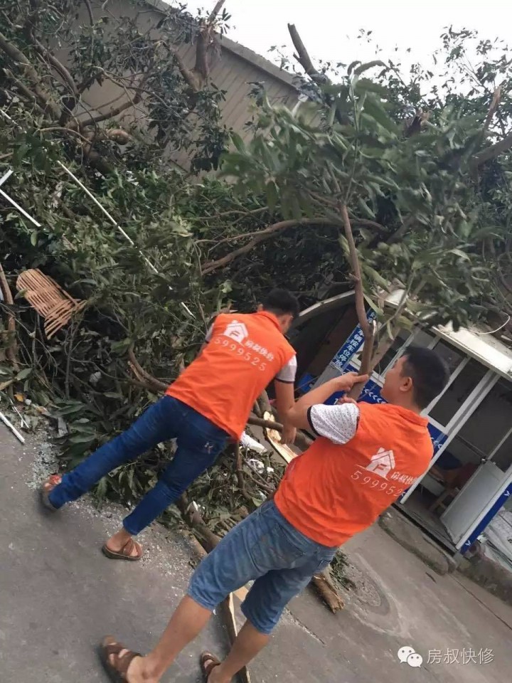 房叔快修工作人员正在清理掉落的树枝。