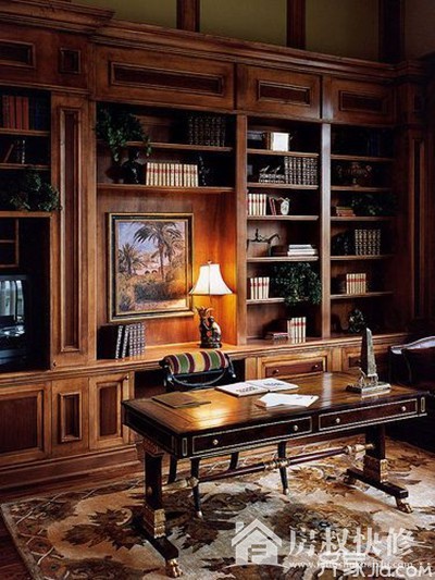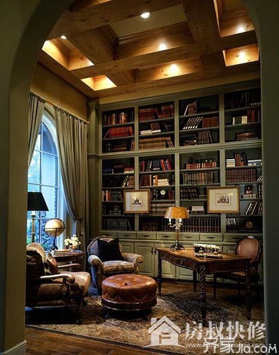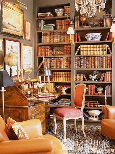 这样的一间书房就像电影中的场景,古典皮沙发,有精美雕花的书桌,满屋的精装书,还有昏暗的灯光……真希望自己也能拥有一间这样的书房!