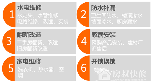 房叔快修拥有丰富的行业经验及行业资源,服务项目广泛全面,囊括了:整体翻新、局部改造、墙面粉刷、地面维修、防水补漏、水电维修、卫浴维修、泥水维修、门窗维修、打孔安装、家具家电维修等翻新维修项目。