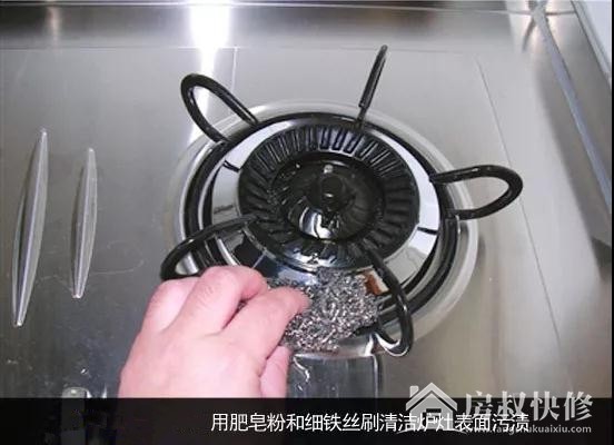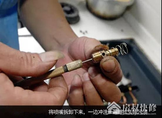 喷嘴堵塞影响出火,可以用细铁丝刷去碳化物,用毛刷将污垢刷掉。如果堵塞严重的,可找来钢丝球,将喷嘴拆卸下来,最后通过一边冲洗一遍擦拭的方式,去除污渍。