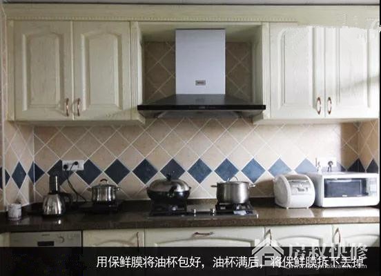 许多人家里面的抽油烟机油杯都会积了一层厚厚的油污,时间久了难以清除。平常可以用保鲜膜将油杯包好,待油杯盛满油后,将保鲜膜拆下丢掉,这样既方便又能保持油杯的干净。
