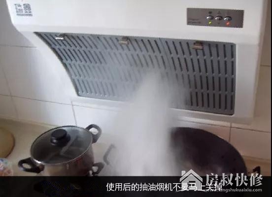 许多人在煮菜后马上关掉抽油烟机,以为这样能省电。一般建议使用完不要马上关掉开关,需要让抽油烟机将剩余的油气排出,特别是残留在抽油烟机内部的油烟,在还可以趁着油气尚热的时候,清洁表面的油污。