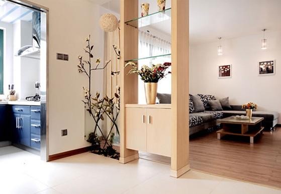 例如适当选择在餐厅的外侧塑造小柜体,将大格局巧妙地分割开来,紧贴电视柜上设置一面珠帘,不但善用电视柜空间而且让整个空间有种宽敞感。